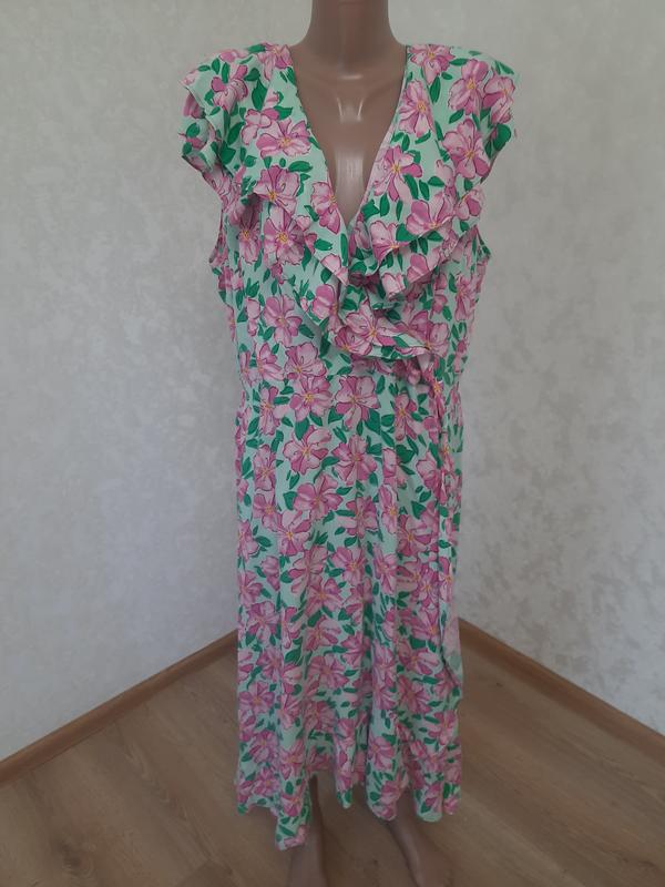 Платье в цвете лето с иммиицией на запах.Большой размер.Стан нового. Замеры: ПГ 65 ПТ 52 ПС 75 Длина 130