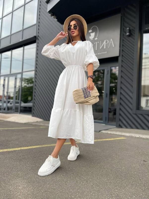 Любимое платье - легкая, комфортная и практичная. Платье длины миди без подкладки. На талии легкая резинка. - Ткань - лён Важно! Оттенок ткани и размер гороха может отличаться (зависимо от поставки тканей). Браком не считается.