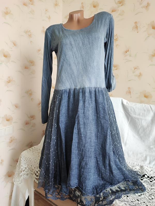 Роскошное брендовое двухъярусное платье из лёгкой ткани. В плечах 42 см. Длина рукава от плеча 58/38 см. ( укорачивается на пуговицу). ПОГ 44 см., хорошо тянется до юбки. В бедрах свободное. Ткань сверху тонкий трикотаж, юбка марлевка с кружевом и прозрачными вставками из сетки. Смотрится очень эффектно и стильно. Состояние идеальное.