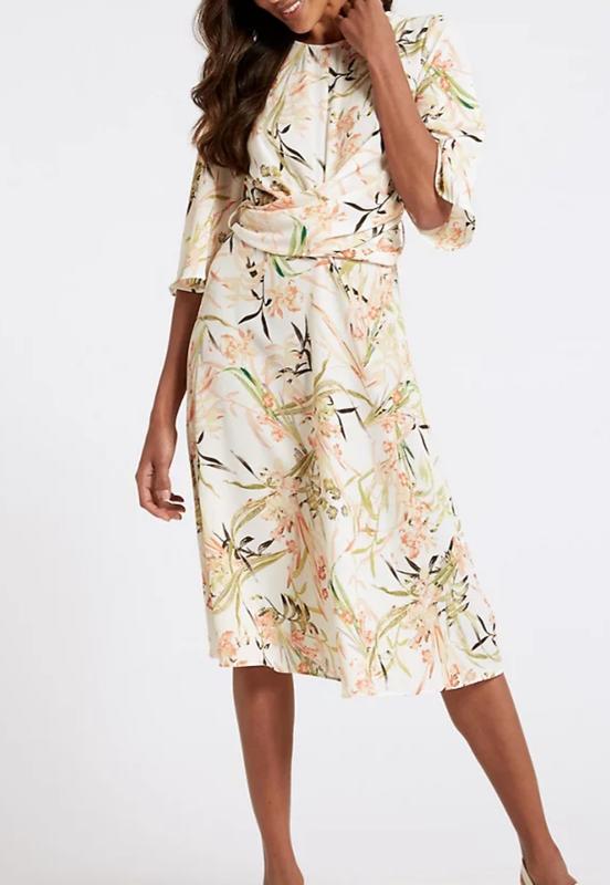 Жаккардовое платье миди в цветочный принт M&S Collection размер 10. Это красивое платье отлично подойдет для официальных мирроприемств или выходных. 3/4рукав, пояс на запах