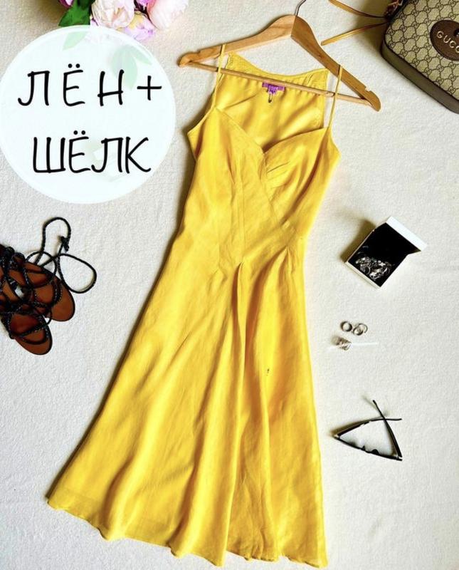солнечное платье, которое поднимает настроение. восхитительный силуэт, красивое декольте, состав 80% лен, 20% шлк на подкладке из ацетатата купленная здесь на шкафе. новая, без бирки. немного тесная в груди. подойдет на объем 75В, небольшая С