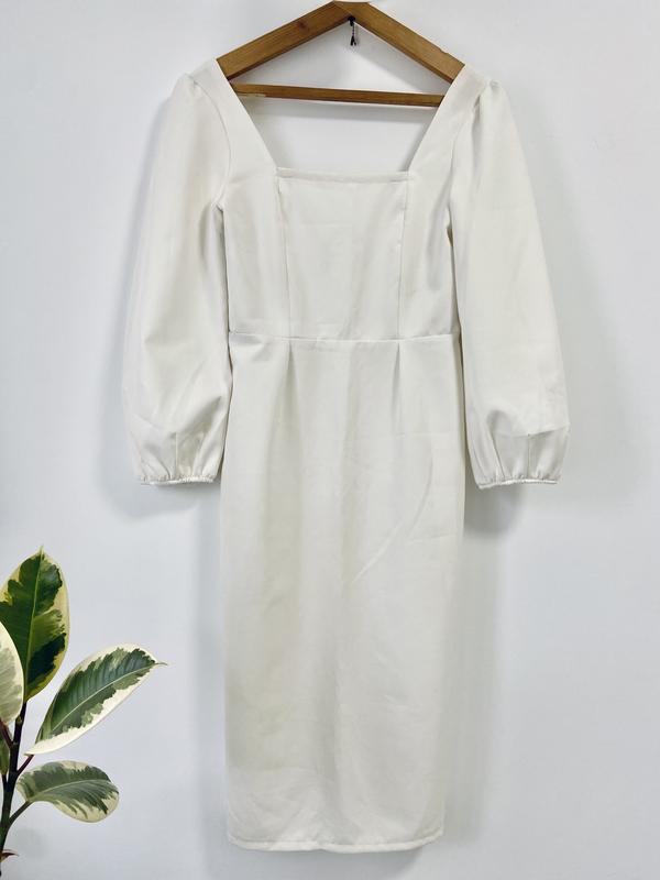 Праздничное платье в светло молочном цвете, квадратный вырез спереди, взади наполовину открытая спинка застегивается на потайной замок. Пышные рукава. Длина миди. Стан идеален. Ткань дорога костюмка, плотная, немного тянется. Размер s-m