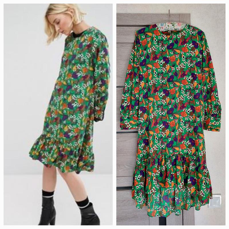 Яркое платье с ассиметричным низом, цветочный принт, круглая горловина, длинный рукав styl...