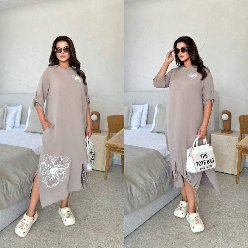 Ткань штапель Цвет черный, синий, фрезовый, бежевый Размер 48-50,52-54,56-58 Платье свободного кроя, с накатом, с капюшоном, с карманами. Рукав с патиком и рабочей пуговицей. Ассиметричный низ на кулиске. har