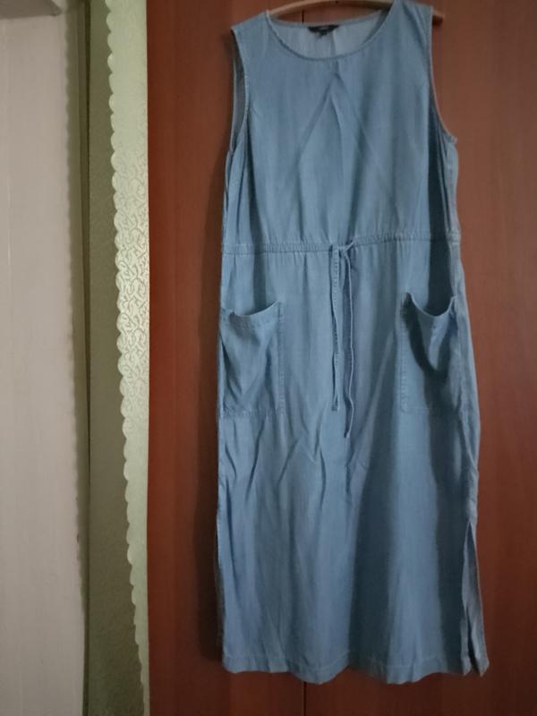 легенька літня бавовняна сукня міді. під джинс. довжина 126 см, пог 60 см, по талії шнурок, пос 63 см. тканина не тягнеться. відмінний стан.