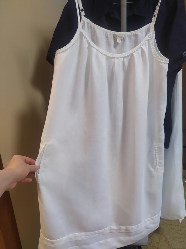 Новое платье натуральное, белоснежное. Есть карманы, еще зашитые. Длина от плеча 92см, пог49, бедра свободно