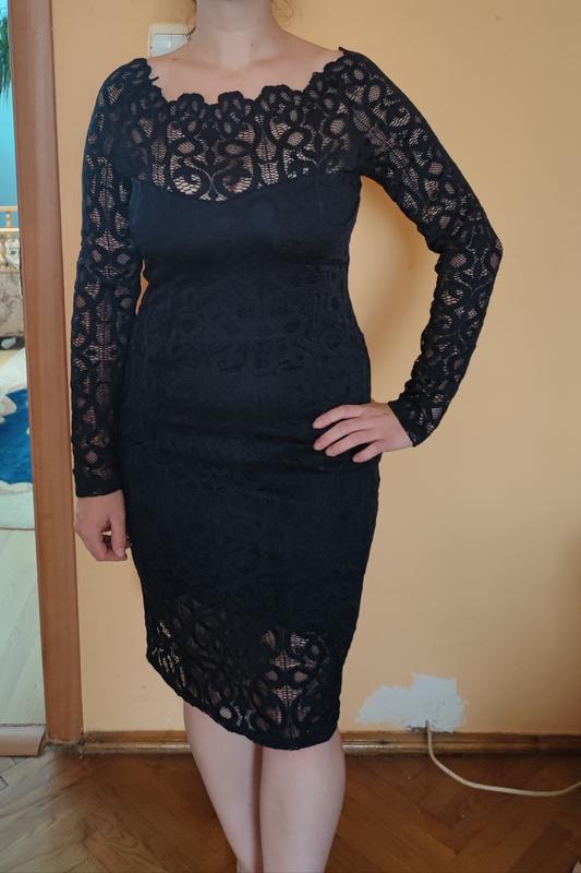 Платье-футляр облегающего силуэта, с длинными рукавами из темно-синего гипюра на темно-синей подкладке. Подойдет на размер 44-46 Объем груди - 80 Длина платья- 1 метр Длина рукав- 62