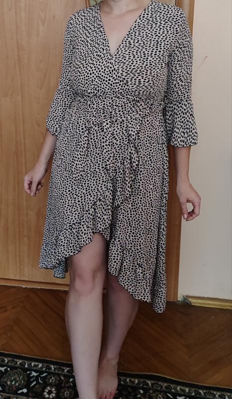 Меди-платье от Typical Jill с запахом спереди, завязкой на талии и животным принтом и длинными рукавами с узкими эластичными манжетами. Размер 44-46
