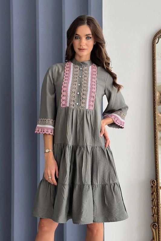 Фактурна тканина з лляним переплетінням. Льон 45%, віскоза 35%, поліестер 20% Зріст моделі 174 см Довжина виробу 100 см Довжина рукава 45 см Обхват по лінії грудей 96 см Обхват по лінії талії 96 см Обхват по лінії стегон 112 см Всі параметри вказані на розмір S З кожним розміром об'єм збільшується на 4 см.