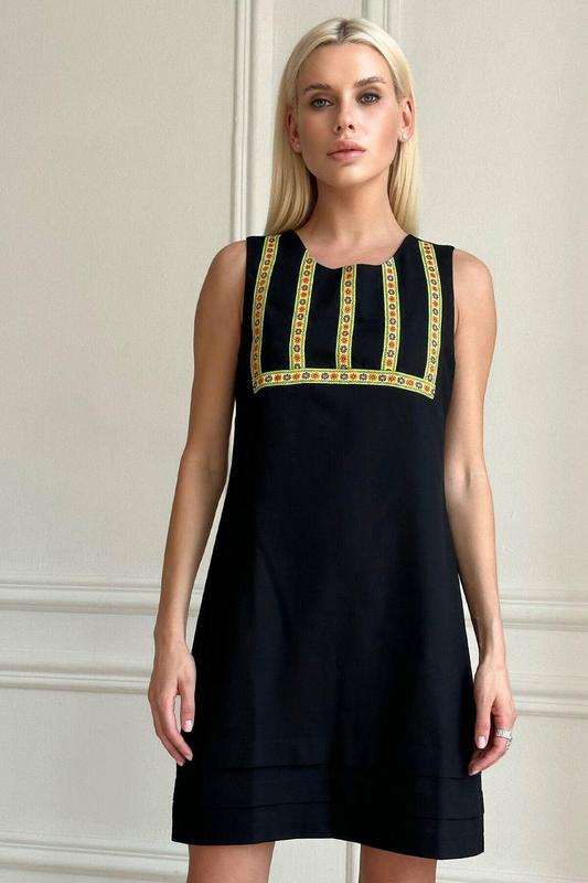 Льон 100 % Зріст моделі 174см Довжина виробу 90 см Обхват по лінії грудей 92 см Обхват по лінії талії 94 см Обхват по лінії стегон 100 см Всі параметри вказані на розмір S З кожним розміром об'єм збільшується на 4 см.