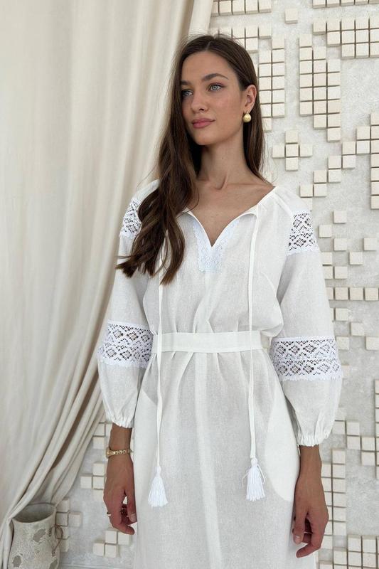 Льон 100%. Довжина виробу 94см Довжина рукава (реглан) 56 см Обхват по лінії грудей 100 см Обхват по лінії стегон 106 см Всі параметри вказані на розмір S З кожним розміром об'єм збільшується на 4 см.