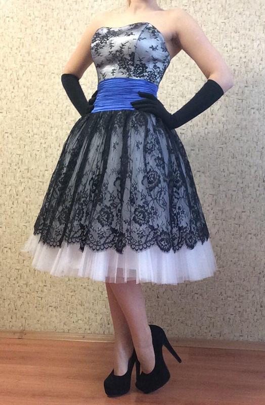 Гипюровое платье в стиле 60-х. Размер регулируется за счет корсета. Пышная юбка за счёт многослойности. На поясе широкая синяя лента, которую можно завязать бантом или красивым галстучным узлом. Перчатки в комплекте. Самовывоз в Киеве или отправка новой почтой по предоплате