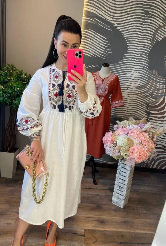 невероятно красивое и универсальное платье прямого силуэта с элегантным разрезом на груди, пышными рукавами на резинке внизу, удобным вшитым поясом, прекрасно подчеркивающим красоту вашей фигуры, и потрясающе красивой вышивкой на груди, платье выполнено из искусственного льна высокого качества трендовое платье с вышивкой всегда будет модным и актуальным, в ней вы будете выглядеть свежо и элегантно в любой жизненной ситуации размер единственный 42-46 длина 119-120 см, о г 92-94 см, длина от шеи до талии 38 см, длина рукава от шеи 68 см код 916 цена 1280 грн