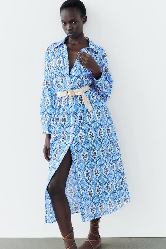 PRINTED DRESS WITH BELT Платье-рубашка с воротником Джонни и длинными рукавами. С боковыми карманами в швах. Контрастний плетений пояс. Застежка на пуговицы спереди. Синий/Белый | 9878/842 100% бавовна пог 49, пос 58, длина 128