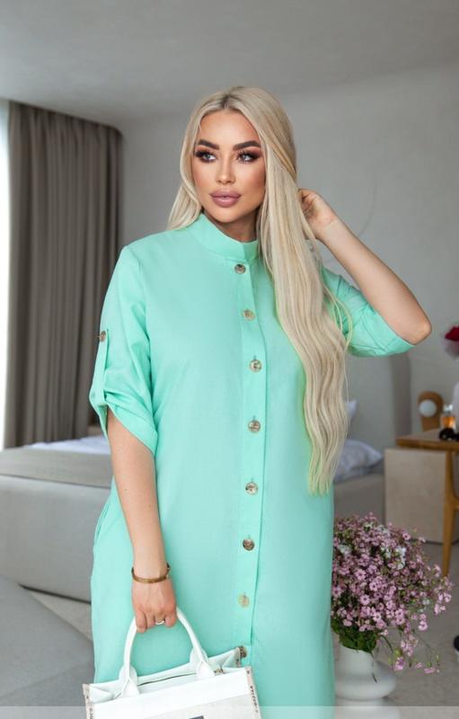 Платье - рубашка женское, миди, льняное, на пуговицах, летнее, батал, плюс сайз, фисташков...
