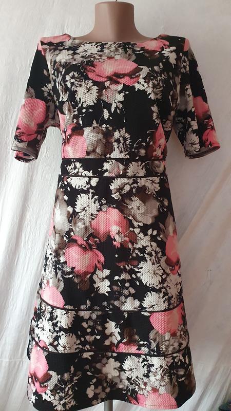 Великолепное цветочное платье. Очень красивая, красиво ложится по фигуре. Подчеркивает талию. Довольно оригинальный и интересный пошив. Низ платья идет трапецией. Материал красиво тянется, не осветляется. Верх платья имеет подкладку. Застегивается платьем на спинке - молнией. Размер на фото. Также ориентируйтесь по замерам Длина =93 Пог = 53 ( тянется до 57) Пот = 48 Поб=60 Длина рукава =31