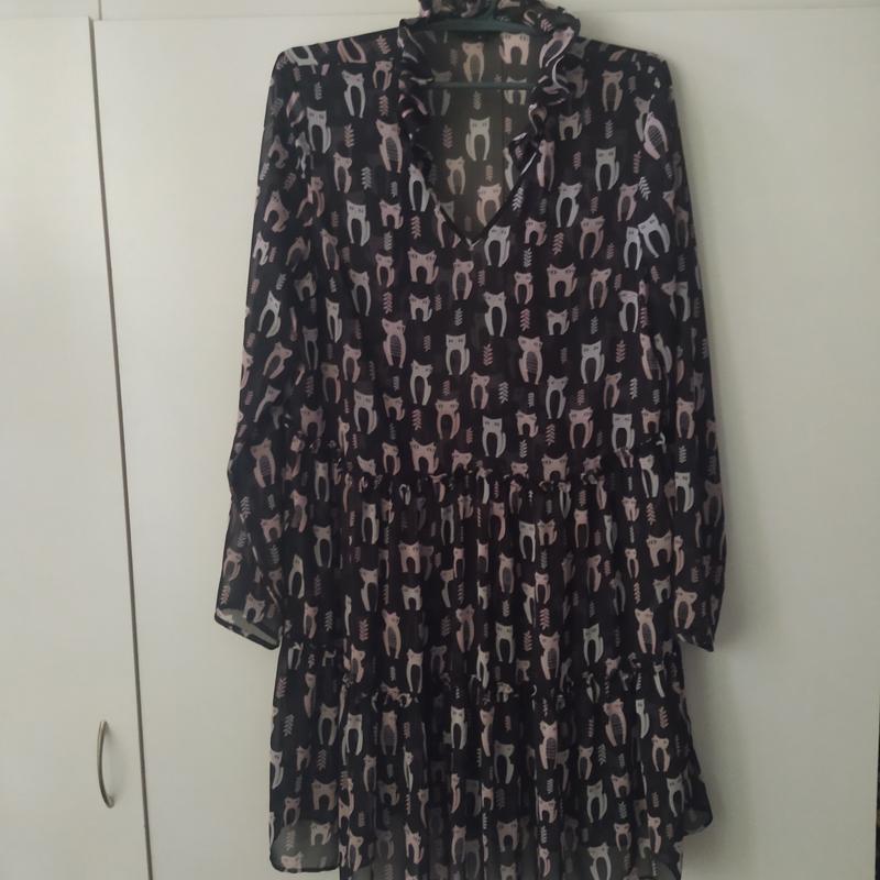 Післяплати немає!!!!! Очень красивое новое летнее платье ярусами Принт- . в котиках Свободное, легкое.Ткань типа шифона.Без подклады, втачной рукав.Указан 16 размер,~ так и есть. ПОГ 56см.ПОТ - 55см.ПОБ 86 см.Длина - 100 см Рукав- 65см