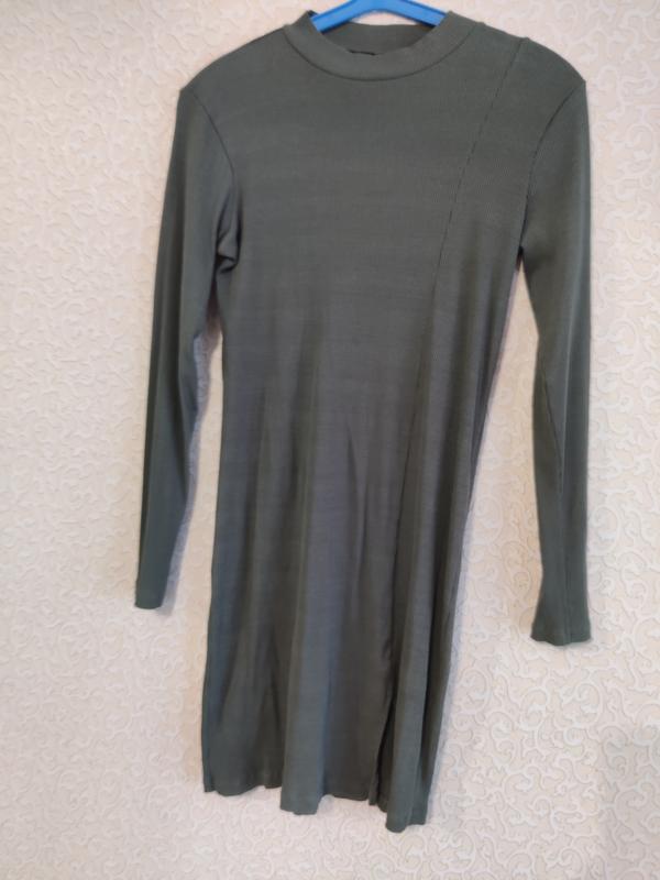 Очень практичное платье в рубчик, одевала однажды не мой фасон((((есть маленький разрез на ноге,размер 48-50гарно тянется! Оливкового цвета!