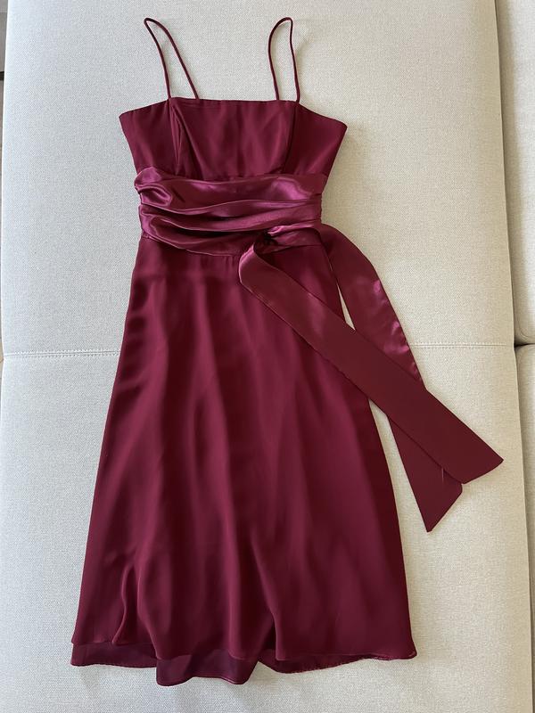 Сукня бренду Rebecca Очень красивый бордовый оттенок Атласная вставка под грудью Ленту на поясе можно завязать как спереди, так и сзади, на бант или просто на узел Двухслойная - атласная подкладка и легкий верхний слой Очень красиво ложится нижний край юбки Есть косточки "в груди" Брытельки подшиты на пару см, можно расшить и сделать длиннее или короче Сделано в Америке Замеры: Пояс 2 * 36 см Длина спереди без бретель ~94 см