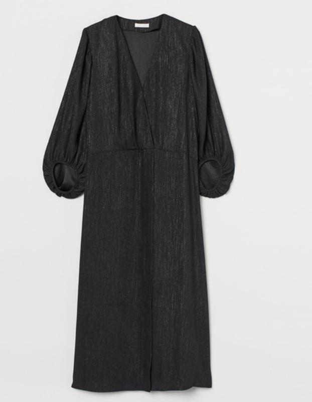 Платье длиной до икр из жатой ткани из вторично переработанного полиэстера с v-образным вырезом горловины и пришитым запахом спереди. Длинный пышный рукав с узкой закрытой резинкой на манжетах. Отрезная линия бедер и слегка расклешенная юбка. Размер от м до хл Платье новое, не одето.