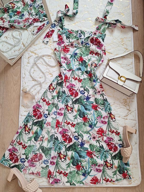 Летнее платье миди в цветочный принт с разрезом на ноге на завязках сарафан
