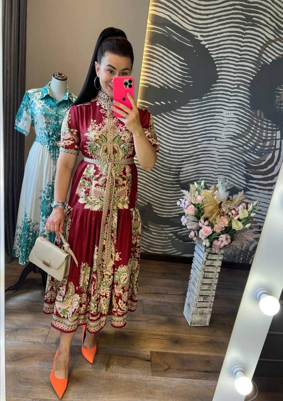 шикарное платье, сочетающее в себе идеальный внешний вид и отличное качество платье с короткими рукавами, воротником-стойкой, заниженной талией и пуговицами спереди, дополненная поясом, выполненное из смеси коттона и вискозы, украшено отличным принтом, этот материал сочетает в себе комфорт и воздухопроницаемость коттона с мягкостью и эластичностью вискозы, воротник-стойка придает образу утонченность, а заниженная талия добавляет платья оригинальности и женственности, пуговицы спереди делают платье удобным и практичным, а пояс подчеркивает талию и создает завершенный образ. размер единственный 42-46 длина 126 см, длина от шеи до талии 62 см, объем груди 96-98 см, длина рукава от шеи 39 см код 2883