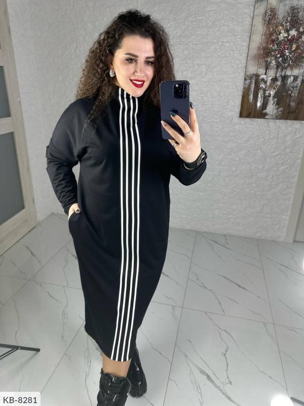 Сукня KB-8281 917VL Розмiри: 50-52, 46-48 Тканина: двухнитка (хорошої якості), стрейчеві пришивні смужки (чотири штуки) Вільне плаття, з переду пришивні чотири білих смужки, з боків кишені, ззаду блискавка Параметри блондинки моделі-норми ОГ 100, ОТ 80, ОС 104, зріст 170см, на ній 46-48, параметри брюнетки моделі-батал ОГ 112, ОТ 88, ОС 112, зріст 165см, на ній одягнений 165см. Заміри виробу Розмір 46-48: Об'єм грудей 120 Об'єм талії 114 Обсяг стегон 114 Довжина рукава від шва 44 Довжина сукні по спинці 112 Розмір 50-52: Об'єм грудей 126 Об'єм талії 120 Обсяг стегон 120 Довжина рукава 44 Довжина сукні по спинці 113 Розмір 54-56: Об'єм грудей 134 Об'єм талії 128 Обсяг стегон 128 Довжина рукава 44 Довжина сукні по спинці 114 Розмір 58-60: Об'єм грудей 140 Об'єм талії 136 Обсяг стегон 136 Довжина рукава 44 Довжина сукні по спинці 114