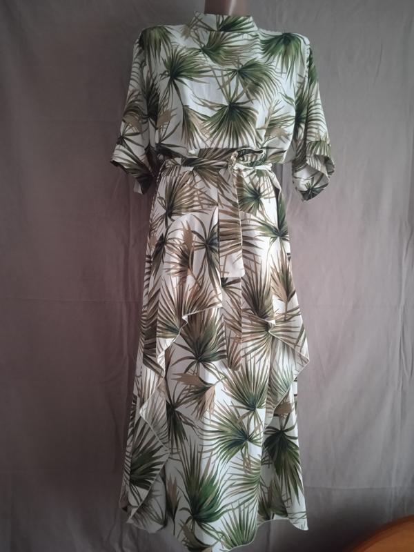 пог 59, пот 56, рукав 27, плечи 44, длина по спинке 110, спереди волан, есть пояс, хотя размер указан M/L, идет на XXL