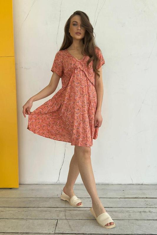 Штапельна тканина. Склад: віскоза 97%, еластан 3% Зріст моделі - 166см Довжина виробу 90 см Довжина рукава 18 см Об'єм по лінії грудей 90 см Об'єм по лінії талії 104 см Об'єм по лінії стегон 130 см Всі параметри вказані в розмірі S З кожним розміром об'єми збільшуються на 4 см