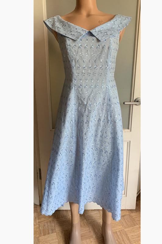 Легчайшее летнее приталенное платье. Ткань - шитье, нежного голубого оттенка. Рукав - "крылышко", переходящее в воротничок. Сквозная застежка - пуговицы, на спине. Пятен, дефектов нет. Замеры: ПОГ - 44 ПОТ - 36 Длина - 118