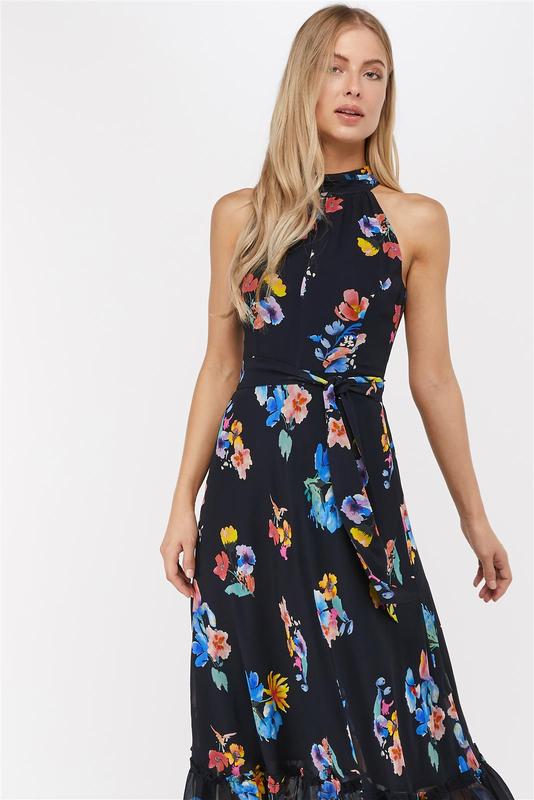 Красивый принт на черном фоне Тканина шифонова Платье полностью на чехле из вискозы Силуэт приталенный с расклешенной юбкой По низу оборка Застежка на длинную молнию и пуговицы сзади Есть пасок Длина 120 см длина по боковому шву 100 см ПОГ 46 см ПОТ 37 см ПОБ 62 см (подъюбник 50 см) По низу по линии притачивания оборки 110 см