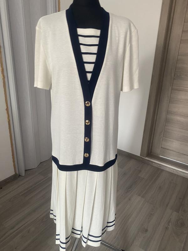 Трикотажное платье белого цвета с вставками темного. Модель с заниженной талией, юбка пошита в виде «плиссировки»