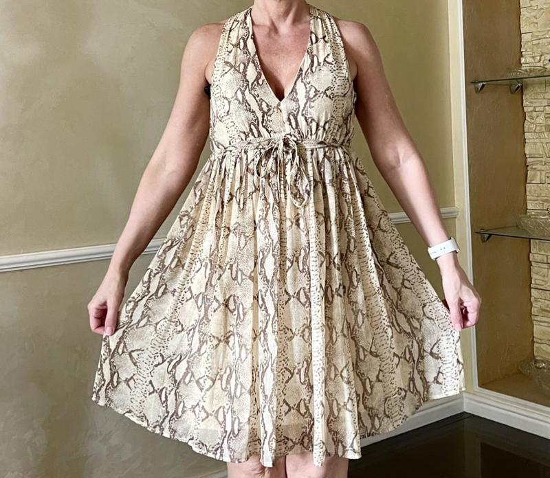 отличное платье. Фото на модели с размером S, идет и на М. Ткань легкая, воздушная, на подкладке, отличный принт/ рептилия. Состояние отличное, сток.