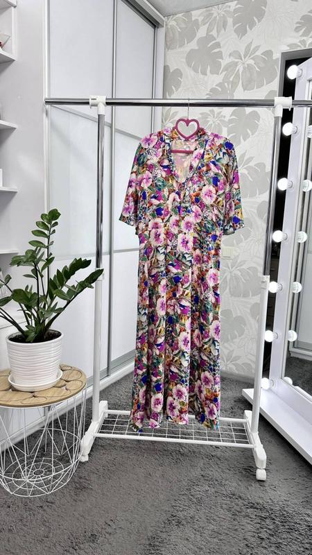 Очень красивое платье-миди в цветы, р. 16. Спереди платье имеет невысокий разрез. длина 131 см, длина до линии отреза 42 см. ог 104-105 см. от 84 см. ос 124 см. Фото на тілі немає!