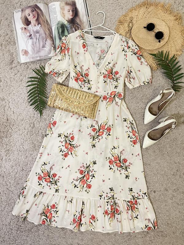Для більш точного визначення, виміри, порівнюйте із вимірами подібної речі, а не зі своїми обсягами. Романтична міді сукня у квітковий принт. Тканина тонка, трохи просвічується, не тягнеться. Крій ліф по фігурі,. Талія відрізна, на резинці. Спідниця трапеція. Манжети резиночки. Стан: ідеальний. Дефекти: немає. Розмір на бирці: 12/40 {Виміри виробу вимірюються у напівобхваті, а не від шва до шва!} Виміри виробу: Плечі 39 см., Рукав 30 см., Висота пройми 23 см., Ширина рукава 13-25 см., Напівобхват грудей 53 см., Напівобхват талії 38-51 см., Напівобхват стегон 54 см., довжина по спині 115 см., довжина від плеча 116 см.. довжина від плеча до талії 34 см.. Склад тканини: 100% віскоза. Країна виробник: Туреччина. Бренд: F&F. Оплата і доставка: Оплата на картку монобанк. Бронювання на оплату тільки 24 г. При змінах наміру купувати обов'язково повідомляйте! Доставка: На час введення воєнного стану, уточнюйте, чи можлива доставка до Вашого пункту. Актуальні новини можна уточнити на сайті перевізника та за номером телефону контакт-центрів. Не забудьте ПІДПИСАТИСЯ, щоб бути в курсі всіх новинок та розпродажів!
