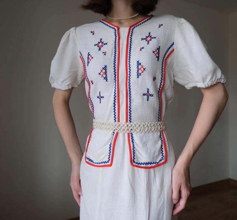 ПОСЛЕПЛАТЫ И БЕЗОПАСНОСТЬЮ ОПЛАТЫ НЕРАБОТАЕТ Винтажное платье с вышивкой ✨️Превосходная сохранности, есть минимальные недостатки ✨️Размер не указано, на фото на XS, рост 170 см ✨️Невероятная находка, платье судачивая со всего ручной работы, интересные детали и красивый крой. Состав ткани не указан, но она текстурная и приятная на ощупь, без подкладки, поэтому может просвечивать. В области талии присутствуют небольшие петплики для пояска, его не было, но по желанию добавления к платью ремешок с фото. Молнии нет, единственные застежки только те, что на фото. Недостатки: внутри, под застежка есть небольшая желтая пятнышка, сама эта область также имеет пожелтение, скорее всего от застежки и времени; внутри, в области талии слегка разошелся шов; на рукавах, где находится резинка, также распашонка, резинки функционируют, но это отличная возможность заменить их и убрать недостаток Перед заказом ознакомьтесь с разделом "Про меня"❗️