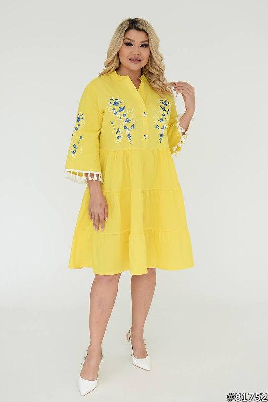 Тканина : турецький коттон ( машинна вишивка) Кольори : жовтий, блакитний, чорний, білий Плаття прикрашене на грудях та рукавах машинною вишивкою, рукав прикриває лікоть , по низу з китицями, на грудях два ґудзики , по низу три волани. Параметри моделі 108-86-110, зріст 165см, на ній представлений 50-52. Заміри по зовнішньому шву: 42-44: ОГ102, ОТ96, ОС130, довжина 96см, рукав 42см, біцепс 36см, плечі 43см; 46-48: ОГ106,ОТ102, ОС150, довжина 97см, рукав 43см, біцепс 38см, плечі 44см; 50-52: ОГ114, ОТ108, довжина 98, рукав 43, біцепс 40см, плечі 44; 54-56: ОГ120, ОТ118, ОС164, довжина 99, рукав 44, біцепс 42, плечі 46; 58-60: ОГ130, ОТ128, ОС182, довжина 99, рукав 43, біцепс 44, плечі 48. Платье Размеры: 46-48,50-52,54-56,58-60 Ткань: турецкий коттон (машинная вышивка) Цвета: желтый, голубой, черный, белый Платье украшено на груди и рукавах машинной вышивкой, рукав по локоть, по низу с кисточками, на груди две пуговицы, по низу три волана. Параметры модели 108-86-110, рост 165см, на ней представлен 50-52. Замеры по внешнему шву: 42-44: ОГ102, ОТ96, ОБ130, длина 96см, рукав 42см, бицепс 36см, плечи 43см; 46-48: ОГ106, ОТ102, ОБ150 50-52: ОГ114, ОТ108, длина 98, рукав 43, бицепс 40см, плечи 44; 54-56: ОГ120, ОТ118, ОБ164, длина 99, рукав 44, бицепс 42, плечи 46; 58-60: ОГ130, ОТ128, ОБ182, длина 99, рукав 43, бицепс 44, плечи 48. а дол