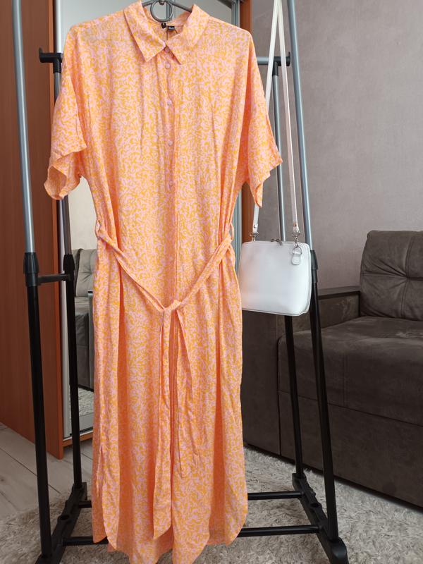 Ленесочное платье рубашка, спереди пуговицы, есть пояс. Есть рисуночка, которую практически не видно. ПОГ- 55 Длина 125
