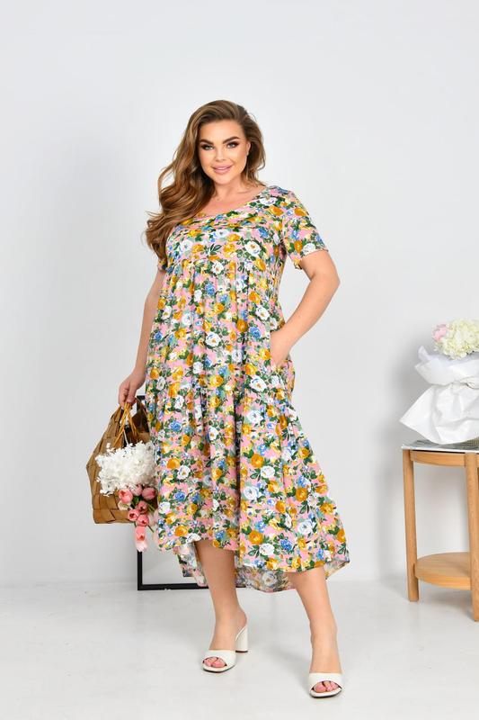Сукня №21-153 тканина: штапель р-ри:52-54,56-58,60-62,64-66 РАСТЯЖНОСТЬ: отсутствие растяжимости Ориентировочные замеры готового изделия: 52-54 р-р: длина платья 123см, длина рукава от плечевого шва 23см, обхват рукава 38см, ОГ - 110см, ОТ -110см, OC -170см. 56-58 р-р: длина платья 124см, длина рукава от плечевого шва 23см, обхват рукава 41см, ОГ-118см, ОТ-118см, OC-180см. 60-62 р-р: длина платья 125см, длина рукава от плечевого шва 24см, обхват рукава 44см, ОГ - 126см, ОТ-126см, OC -190см. 64-66 р-р: длина платья 126см, длина рукава от плечевого шва 24см, обхват рукава 46см, ОГ - 134см, ОТ -134см, OC -200см.