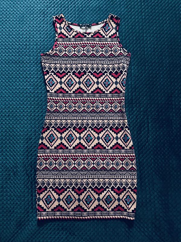 Платье полностью по фигуре, с очень классным летним принтом. Идеально подойдет на размер XS/S. Она эластичная, тянется и идеально прилегает к телу. Длина выше колен.