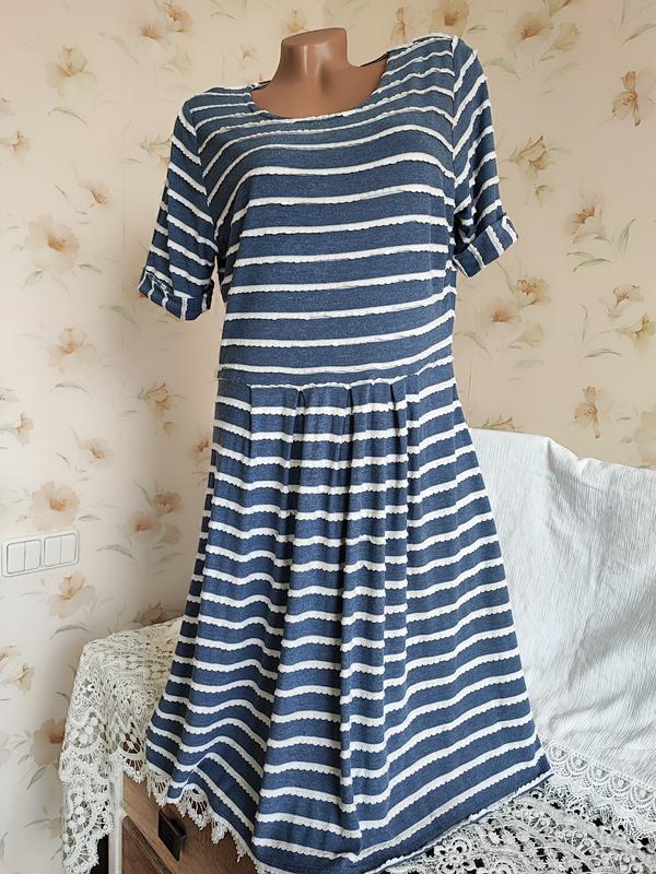 Отличное летнее брендовое платье в полоску. Неглубокий круглый вырез горловины. В плечах 38 см. Короткий рукав, длина от плеча 24 см. Ткань эластичная, тянется. Смотрится очень стильно. Состояние идеальное.