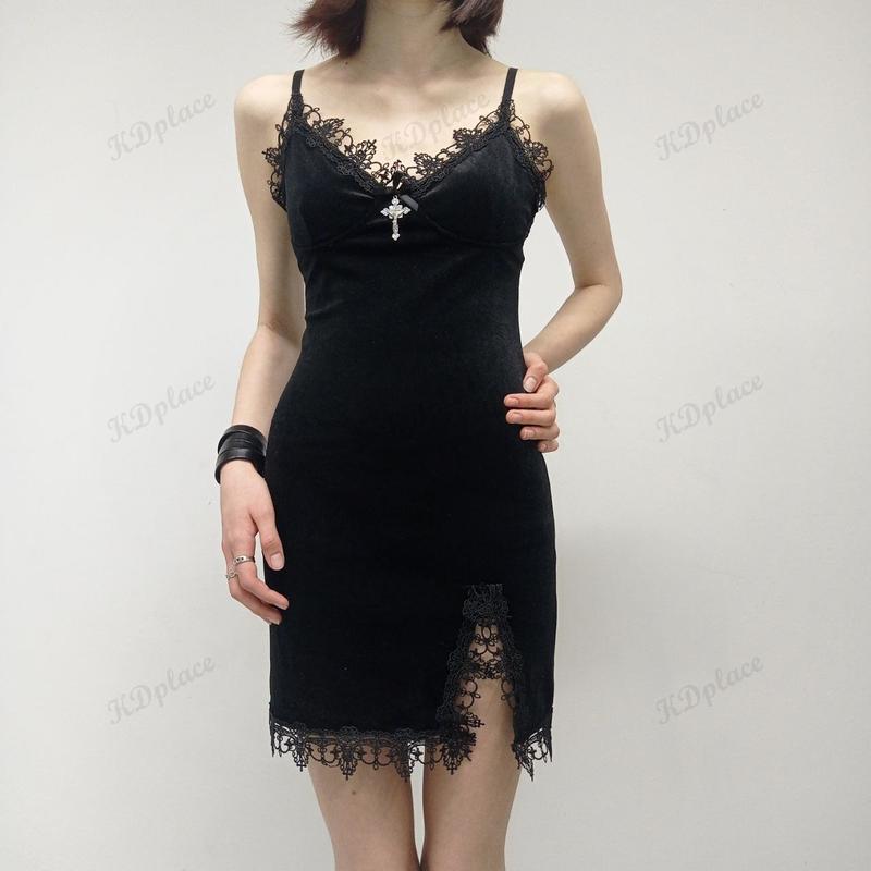 Облегающее короткое платье на регулируемых бретелях и с вырезом, в готическом стиле, бархатное с кружевом, маленькое черное платье, отлично тянется, садится по фигуре. Длина платья: мини. Цвет: черный. Материал: полиэстер. Структура ткани: бархат. Производителем указаны следующие параметры: Размер / грудь / талия / бедра / длина платья / Факт.размер Size S / 69-86 см / 60-68 см / 75-90 см / 66 см / факт.XS-S Size M / 73-90 см / 64-72 см / 79-94 см / 68 см / факт.S-M Size L / 77-94 см / 68-76 см / 83-98 см / 70 см / факт.M-L Size XL / 81-98 см / 72-80 см / 87-102 см / 72 см / факт.L-XL По результатам фактической примерки платье маломерит на половину/один размер от Вашего обычного международного размера