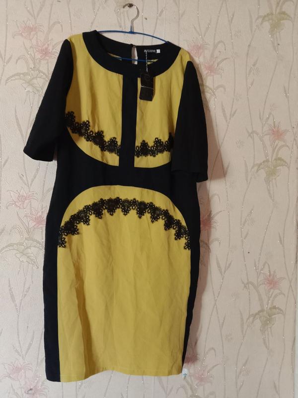 Елегантна сукня на кожен день або визначну подію, гарно підкреслює фігуру. На бірці зазначено 54 р., прикрашена мереживом, колір тьмяно-жовтий, жовто-оливковий, НЕ яскравий. Пог - 53см, пот - 48, пос - 58, довжина - 105, довжина рукава - 37.