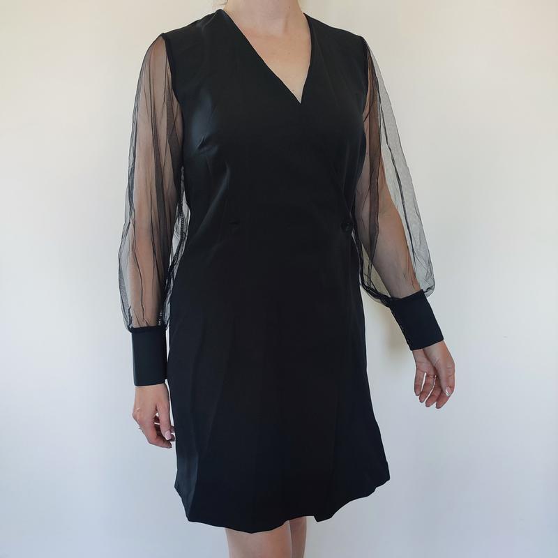 Чорна сукня піджак. Сукня на запах , має 2 ґудзика. Тканина: креп дайвінг. Дуже красива і елегантна. Нова, але нажаль бірку відірвала(Розмір вказаний 42 але на мене сукня велика. За більш детальною інформацією пишіть, надішлю більше фото, заміри.