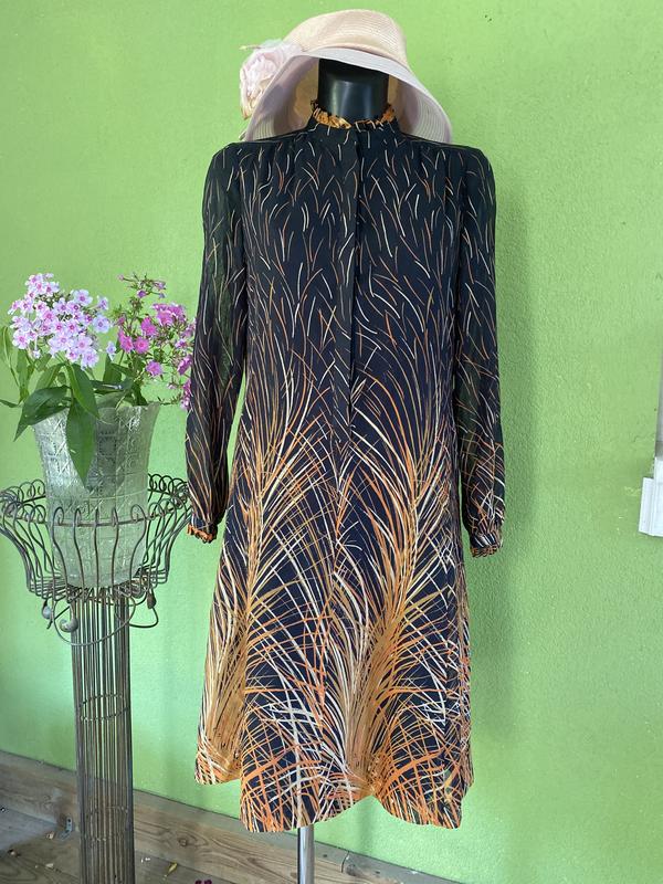 Шикарное винтажное платье от Delmod. Отличная модель, длинный рукав полупрозрачный, на подкладке. Сквозь: хлопок-100/, подклад:вискоза/полиамид. Размер по набору-38. Замеры: длина-100 см, ПОГ-46 см, ПОТ-41 см, ПОБ-48 см, рукав-59 см.