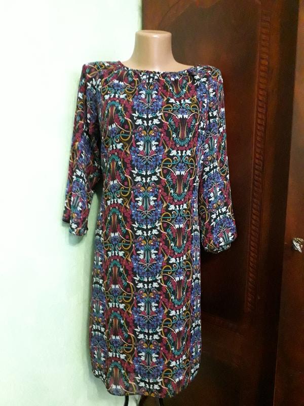 легкое платье туника свободного кроя. Длина по спинке 84 см состав полиестер. Есть подкладка.