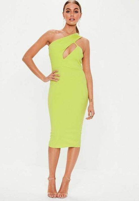 Брендовое платье футляр на одно плечо в модном салатовом оттенке
