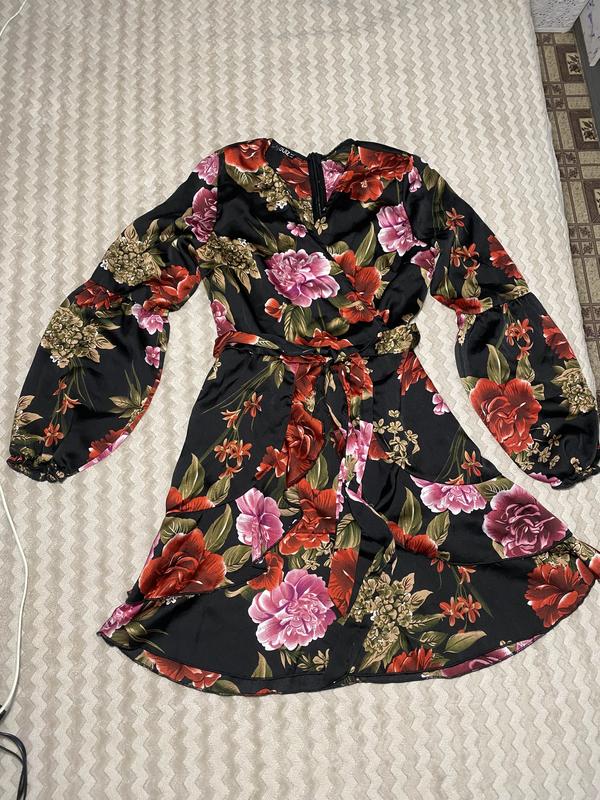 Очень красивое платье с цветами, невероятно женственное и очень стильное. На груди идет на запах, на талии имеет поясочек можно без, к низу идет модельно расклешенная юбка с разрезом и рюшами по краю. Перчатки модель- фонарики, придают пышности и объемчика. Легкая нежная ткань.