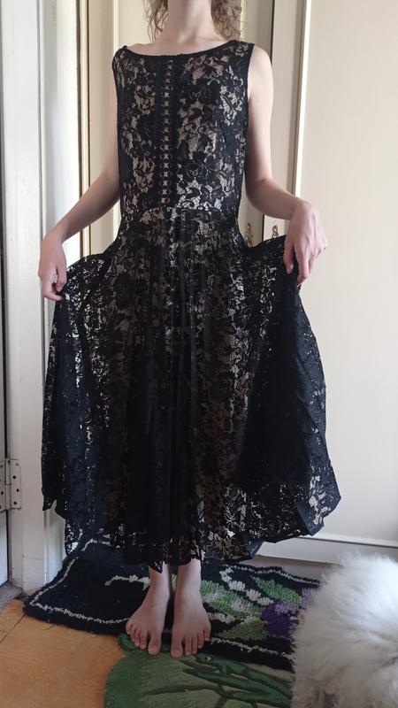 Платье просто невероятное. Очень женственная и обольстительная. Черное кружево на подкладке цвета тела смотрится эротически и загадочно. Сидящий по фигуре безупречно. На фото девочка - 12 лет, на нее больше всего, но можно представить, как она сядет на фигуре размера платья. Стан - безупречен. Размер по набору - 6, но нет, на 8 - идеально.