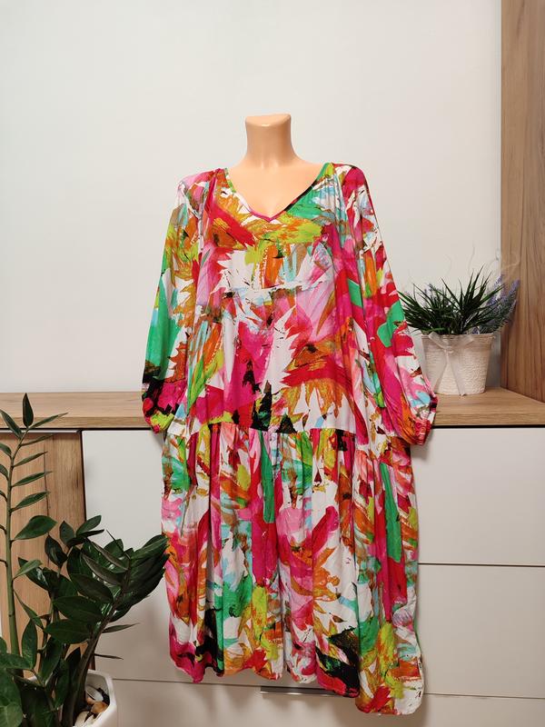 Приятная вискоза, яркий, интересный принт, длина 106, ПОГ 68, ПТ 68, бедра свободные. Подписывайтесь ко мне, есть много хороших вещей и обновление товара почти через день!